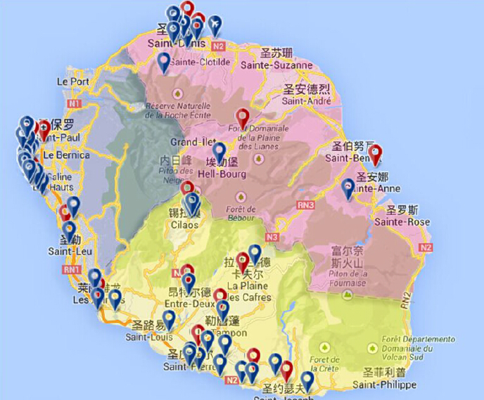 西部地區: 圣保羅(Saint-Paul)—圣勒(Saint-Leu)一線RN1 公路附近。