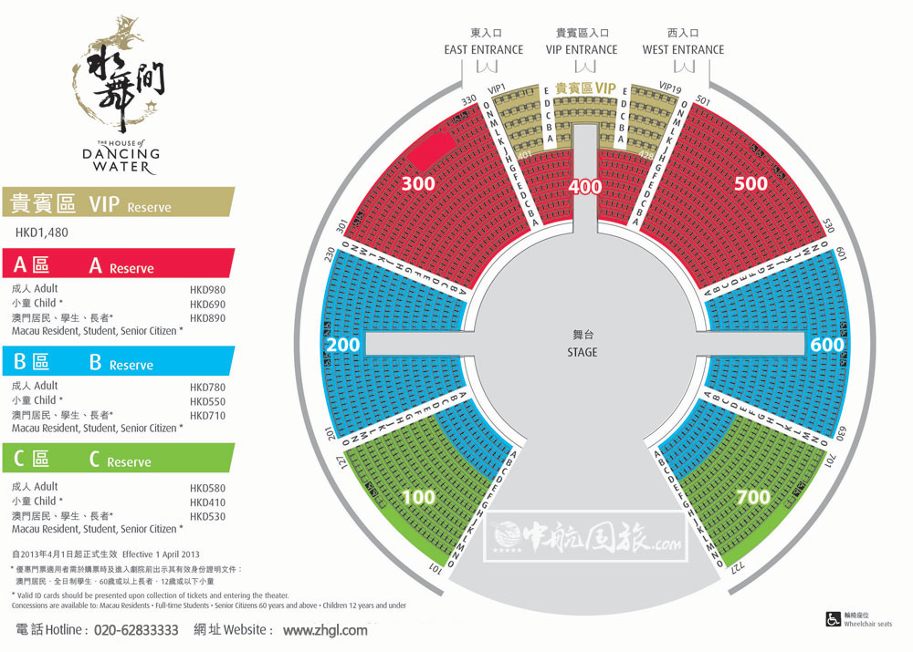 300區及500區的首行由A區改為B區及濕身區,凡購買以上濕身區門票,可自帶雨衣,其他座位區首四行觀眾可能被水濺濕。100區及700區的首四行由B區改為C區,即上述兩個區域現皆為C區。