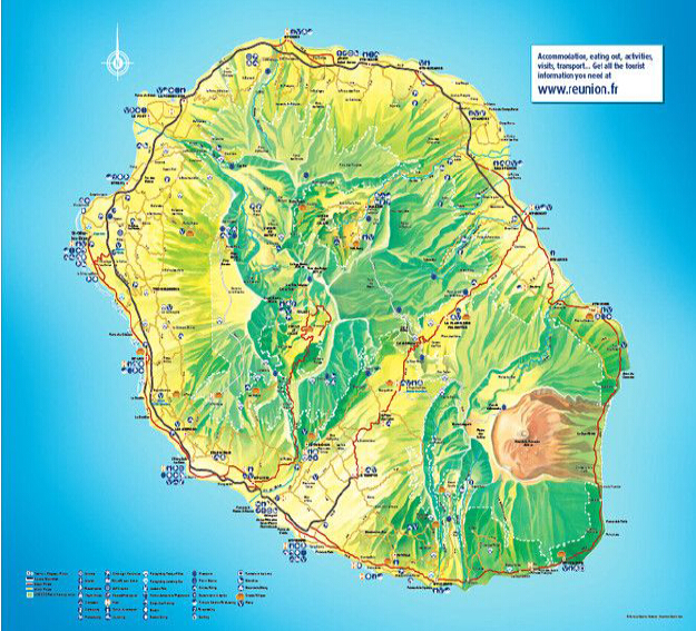 地理:留尼汪島是西南印度洋上馬斯克林群島中的一座火山島,西距馬達加斯加650 公里,東北距毛里求斯190 公里。在留尼汪島稍微以北的地方,還隱約可見塞舌爾群島。這個法國的一小部分領土坐落在一望無際的藍色海洋上,與巴黎的直線距離為9200 公里。留尼汪島特殊的地理位置,賦予其全年宜人溫暖的氣候。從空中俯瞰,它幾乎是一座圓形島嶼。而當人們靠近時,則會驚異于島嶼的形成原因:留尼汪島的誕生源于陸地與大海的碰撞。幾百萬年前,一座火山從海洋中躍然而出。高3071 米的內日峰(Piton des Neiges) 帶來了2512 平方公里豐饒而又迷人的土地。橙色的巖漿定期從富爾奈斯火山(piton de la Fournaise) 噴發而出,這座活火山也是法國的第一座火山,50 萬年前出現在島東南部。最蔚為壯觀的一次噴發是在2015 年2 月.